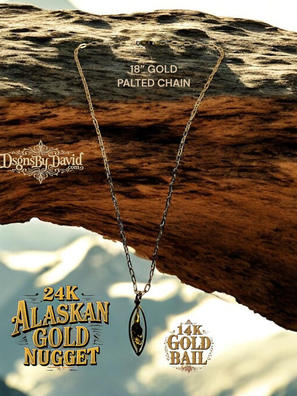 This is a 2.4g, 24K GOLD NUGGET and 14K GOLD BAIL. It is on an 18" GOLD plated chain. The GOLD Nugget is from an ALASKAN GOLD MINE near Skagway, Alaska. I personally purchased this from Skagway, Alaska for our store. 24K gold is 99.9% pure. It is believed to boost blood circulation. 24K gold is said to attract WEALTH and HAPPINESS as well as to provide COMPOSURE, to stabilize the emotional system, to alleviate TENSION and STRESS and to amplify POSITIVE FEELINGS. GOLD IS THE COLOR of VICTORY. GOLD resonates with the HEART, THIRD EYE and CROWN CHAKRAS. The " GOLD NUGGET " is approximately .75" (19.1mm) in length and .25" (86.4 mm) in width. The GOLD pendant is approximately 1.25" (31.9mm) in height and 0.39" (10.0mm) in width. WHEN YOU WEAR HEALING CRYSTALS IN JEWELRY IT INVITES INSTANT HEALING AS THE VIBRATIONS OF THE STONE CAN GET DIRECTLY UNDER YOUR SKIN. We ship worldwide. You can check the price for International Shipping below. 510