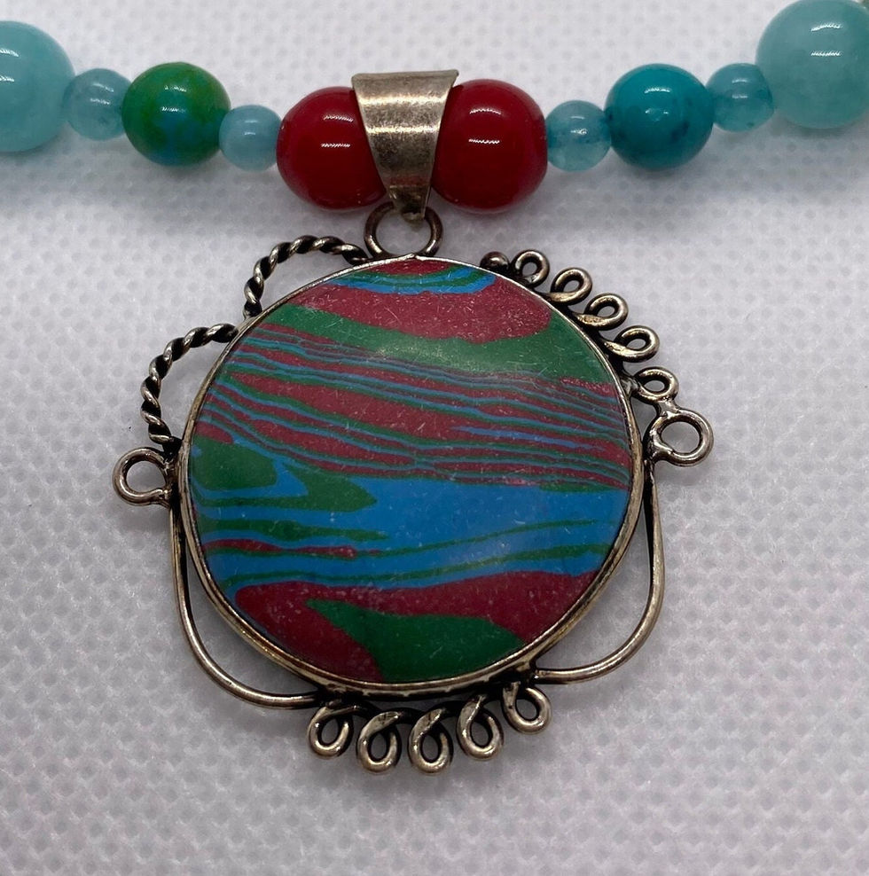 CHAKRA CRYSTAL STONE NECKLACE combining The HEART, THROAT and BASE CHAKRAS: 18" Hand Made Necklace. It is a Rainbow Calsilica Pendant, 1.68" in height, with Blue Amazonite, Red Coral and Blue Phoenix Beads. It has a Lobster Clasp closure. The pendant is 925 Sterling Silver. The Rainbow Calsilica Pendant is associated with both the HEART CHAKRA and the THIRD EYE CHAKRA. This stone can promote a calming effect through the balancing of mind and energy. The colors that are present on this BEAUTIFUL STONE assist the wearer to make the success and goals of their life in an efficient and easy manner. The Blue Amazonite Beads are associated with the HEART CHAKRA and the THROAT CHAKRA. This stone can help you to see both sides of a problem or different points of view. This is known as "THE GAMBLER'S STONE" due to it can bring money, luck and overall success to its wearer. The Red Coral Beads are associated with the BASE CHAKRA. It can promote success in life and business. This stone can help give confidence to those in leadership roles, and even promote luck in sporting events. The Blue Phoenix Beads joins both the HEART CHAKRA and the THROAT CHAKRA. It can teach you to let go of your old self and accept the new self. Blue Phoenix gradually transforms your consciousness, helping you move away from a more fixed rigid state to one that is more open and flexible. When you wear Healing Crystals in jewelry it invites instant healing as the vibrations of the stone can get directly under your skin.