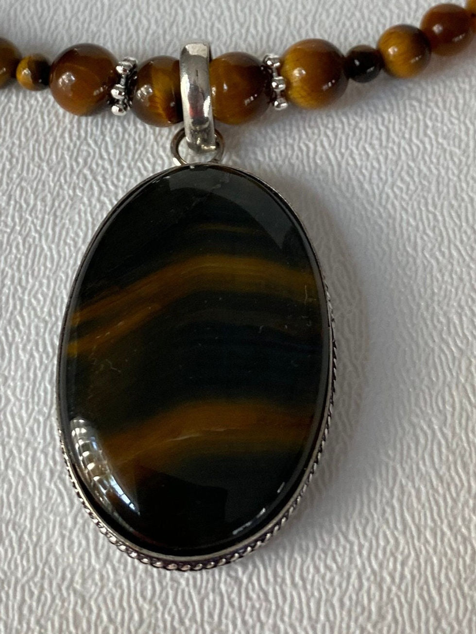 CHAKRA CRYSTAL STONE: Handmade 18" Necklace, 925 Silver Plated, Black Tiger Eye Pendant with Tiger Eye Beads. It is 2.2" in height. The meaning of Tigers Eye is self-confidence and inner strength. The Tigers Eye is a ROOT CHAKRA stone but it is also connected to the SACRAL CHAKRA and the SOLAR PLEXUS CHAKRA too. The ROOT CHAKRA is one of our most important foundational chakras as it determines how safe and secure we feel in the world. The SOLAR PLEXUS CHAKRA is responsible for our sense of self-esteem and the SACRAL CHAKRA is the home of emotion, stimulation and creativity. Tiger Eye is good for growing your confidence and strength and it is known as the "STONE OF COURAGE". This stone can help the wearer to stay strong, centered and connected to their core regardless of the chaos that surrounds them. When feeling blocked, the energy of Tiger's Eye can also cut straight through that lack of motivation and help shift focus by encouraging a more active approach to life. When you wear Healing Crystals in jewelry it invites instant healing as the vibrations of the stone can get directly under your skin.