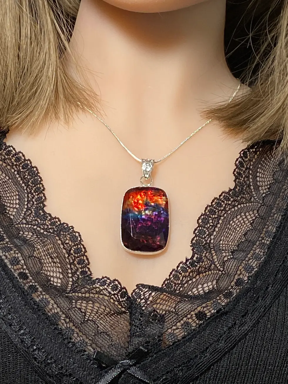 Chakra Stone. Ammolite works with the ROOT CHAKRA. This pendant is 1.89" (48.2mm) in height and .90" (23.0mm) in width. It is on a 18" silver snake chain. This pendant has a solid 925 Sterling Silver Base.