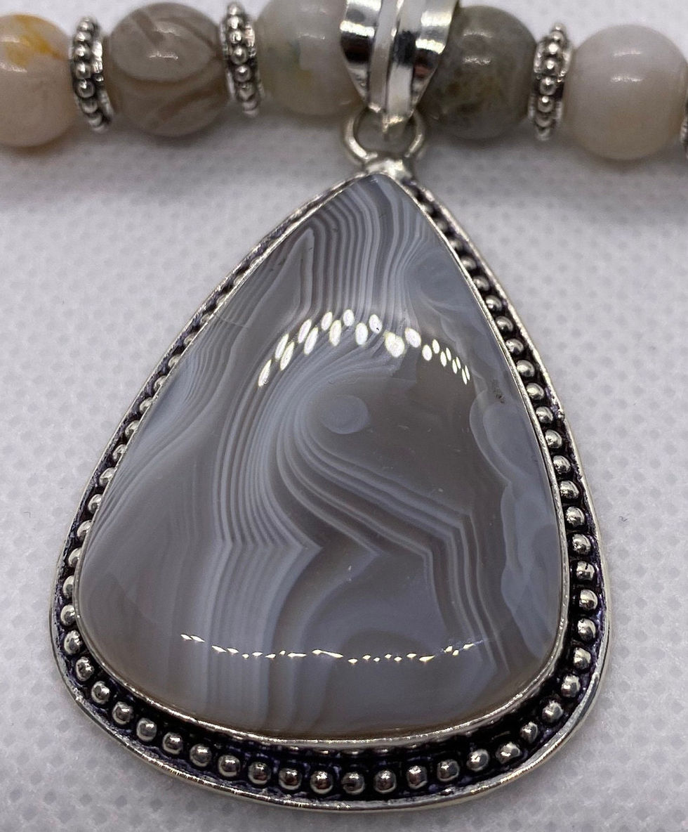 CHAKRA HEALING STONE NECKLACE. This is a 22" Vintage Grey Botswana Pendant (2.2") with Bamboo Agate and Blue Rainbow Labradorite Beads. This pendant has a 925 Sterling Silver Base. It is secured with a Lobster claw closure. Grey Botswana Agate is named after the South African country where it is mined. It is associated with the THIRD EYE, CROWN and ROOT CHAKRAS. Grey Botswana Agate is known for its calming energy reducing feelings of stress and anxiety. This stone is said to enhance mental functions by improving concentration, perception and analytical abilities. It is believed to be handy for problem solving as it promotes resolution and the ability to visualize solutions. Bamboo Agate is associated with the THROAT, THIRD EYE and CROWN CHAKRAS. The speciality of this stone is the overcoming of negativity and anxiety and the replacement of these emotions with peace, self love and happy energy. Blue Rainbow Labradorite is connected to the THROAT and THIRD EYE CHAKRAS. This stone is said to promote creativity, imagination and intuition. WHEN YOU WEAR HEALING CRYSTALS IN JEWELRY IT INVITES INSTANT HEALING AS THE VIBRATIONS OF THE STONE CAN GET DIRECTLY UNDER YOUR SKIN.