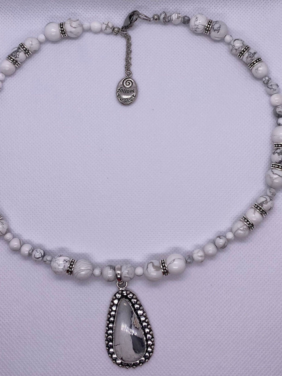 Howlite is known as a stone for patience and calmness. It is said to strengthen memory, inspire creativity and to stimulate desire for knowledge. It is believed to help eliminate rage, pain and stress. Howlite is said to be a crystal that marries you to a more mindful way of life. This is the perfect stone for those looking to bring more calmness and less calamity into their world. CHAKRA CRYSTAL Pendant Necklace with Bracelet. Howlite connects with both the THIRD EYE and CROWN CHAKRAS. The bracelet is a Handmade, Howlite Stone bead, that is a mixture of 4 and 6mm beads and is 16cm (6.3") round. The Howlite Heart Pendant is 2.06" (52.4mm) in height and 925 Sterling Silver. This is a 18" handmade Necklace made with 4,6,8 and 10mm Howlite stone beads. This necklace has a Lobster claw closure. Weight of the necklace is about 3oz.. WHEN YOU WEAR HEALING CRYSTALS IN JEWELRY IT INVITES INSTANT HEALING AS THE VIBRATIONS OF THE STONE CAN GET DIRECTLY UNDER YOUR SKIN. We ship WorldWide. You can check the price for International Shipping Below. 97