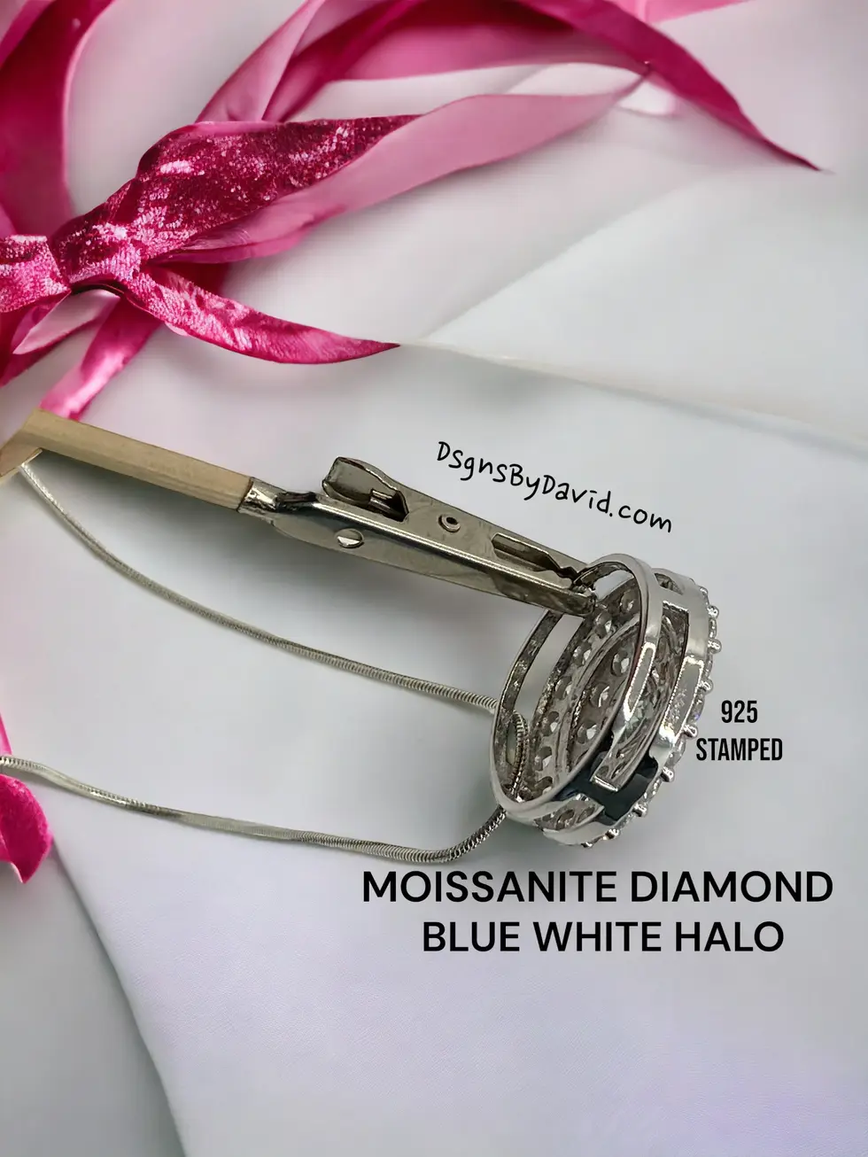 1.25 CT. A Rare and True Knockout in Beauty. A Blue White Moissanite Diamond Halo Pendant Necklace: This Knockout Blue White gemstone is full of FIRE, RAINBOW SPARKLE and perfect for someone who wants a quality DIAMOND at an affordable price. This Blue White Moissanite Diamond Halo Pendant Necklace has the brilliance fit for royalty. Moissanite Diamonds are strong and long lasting. These are Diamonds that can last throughout your lifetime and be passed down to future generations. Moissanite Diamonds are durable enough for everyday wear.