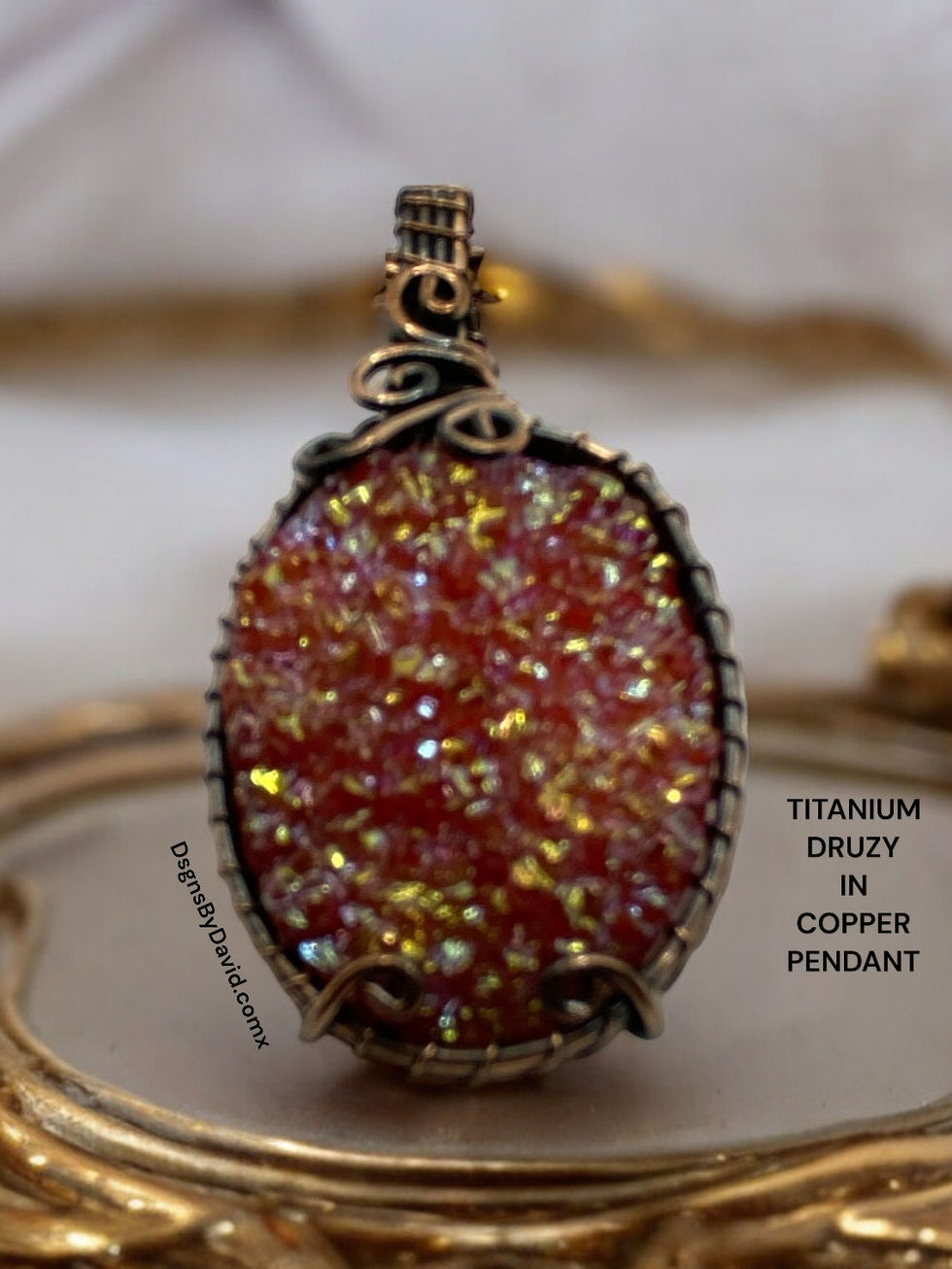 This Titanium Druzy pendant can stimulate, clear and balance ALL of you CHAKRAS. It is known as "The GEMSTONE OF HEAVEN" and is connected to harmony, patience and optimistic love. It is said to stimulate humor and relaxation, enabling one to remove sadness and replace it with joy. It is believed that Titanium Druzy has the potential to stimulate and improve your brain powers. This is the stone that will help you have a more optimistic attitude in all aspects of your life. CHAKRA HEALING STONE Necklace. This pendant brings all of your CHAKRAS into play. The CROWN, THIRD EYE, THROAT, HEART, SOLAR PLEXUS, SACRAL and ROOT CHAKRAS, they are all here. This "BEAUTIFULLY" Copper Wire Wrapped Titanium Druzy Stone is on a 20" Pure Copper Chain. The pendant measures 2.26" (57.4mm) in height and approximately 1.05" (26.7mm) in width. A Pure Copper Chain and Wire Pendant has antimicrobial, anti-fungal and anti-inflammatory properties. Copper worn as jewelry can help protect your body and increase your energy. It can help ease the symptoms of arthritis, reduce stress, slow down the aging process, boost your immunity and improve heart health. Copper can also represent LOVE, PASSION and AESTHETIC APPRECIATION. Copper resonates with the ROOT and SACRAL CHAKRAS. This PURE COPPER Chain is 20" in length. WHEN YOU WEAR HEALING CRYSTALS IN JEWELRY IT INVITES INSTANT HEALING AS THE VIBRATIONS OF THE STONE CAN GET DIRECTLY UNDER YOUR SKIN. We ship worldwide. You can check International Shipping prices below. 397