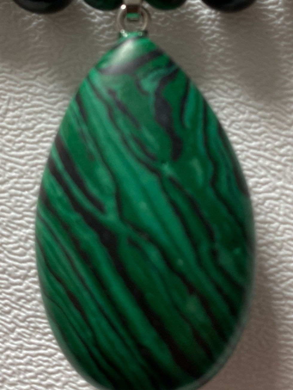 CHAKRA CRYSTAL STONES: This is an 18" Hand Made Ladies necklace. It is made up of a Malachite Water Drop Pendant, Natural Malachite and Natural Black Tourmaline Beads. It has a toggle clasp type closure. Malachite, both pendant and beads, are a powerful HEART CHAKRA crystal. They also work to strengthen your SOLAR PLEXUS CHAKRA and they tap into your THIRD EYE CHAKRA. It is such a balancing stone that it can bring all your CHAKRAS into alignment. Malachite is the essence of joy and is know as the "STONE OF TRANSFORMATION". It can open your heart to all types of love. Natural Black Tourmaline works mostly with the HEART CHAKRA and the ROOT CHAKRA. From the ROOT CHAKRA to the CROWN CHAKRA, the HEART CHAKRA to the THIRD EYE CHAKRA, Tourmaline works with all the CHAKRAS to keep energy flowing in full force. It also supports a reduction of anxiety and stress. When you wear Healing Crystals in jewelry it invites instant healing as the vibrations of the stone can get directly under your skin.