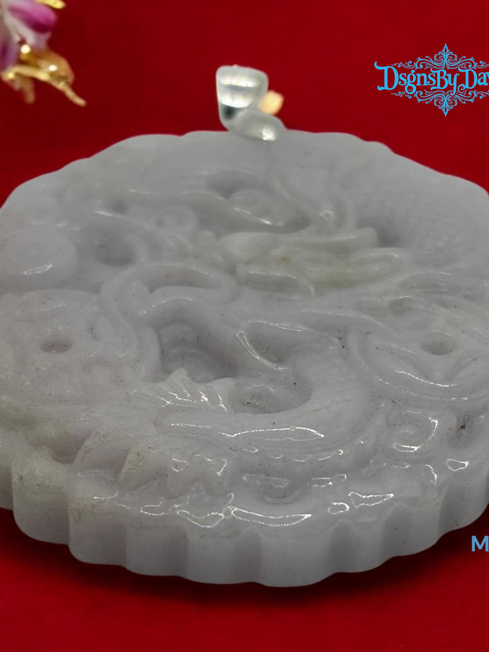 This is a CARVED, Natural MYANMAR / BURMESE JADE DRAGON Pendant. Burma Jade originates from the Hpakan region in Kachin State, Myanmar (formerly Burma), specifically the "Jade Tract" along the Uru River. Jade is a stone of LUCK and OPPORTUNITY that is believed to attract ABUNDANCE, PROSPERITY, EMOTIONAL BALANCE as well as promote COMPASSION and HARMONY. This piece of JADE is associated with the HEART CHAKRA. It measures approximately 1.95" (49.7mm) round. It is white in color and has a 20" silver snake chain. WHEN YOU WEAR HEALING CRYSTALS IN JEWELRY IT INVITES INSTANT HEALING AS THE VIBRATIONS OF THE STONE CAN GET DIRECTLY UNDER YOUR SKIN. We ship Worldwide. You can check the price for International Shipping below. 528