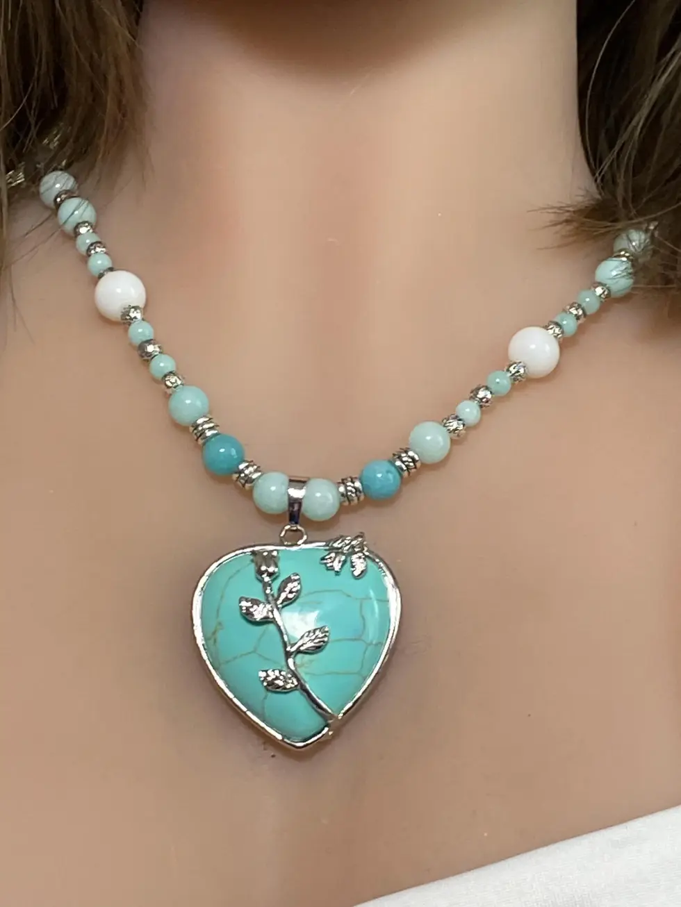 NATURAL TURQUOISE with SILVER Flowers Breaded Necklace