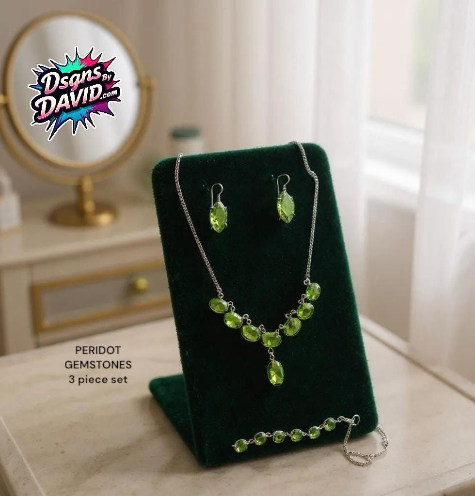 This is a 3 piece Gemstone set of PERIDOT jewelry. It consists of a PERIDOT GEMSTONE NECKLACE, a PERIDOT GEMSTONE BRACELET and PERIDOT EARRINGS all are set in 925 Silver Plating. PERIDOT is know as the "Stone of Compassion". It is believed to bring peace to relationships, inspire eloquence and creativity as well as to bring you delight and good cheer. This is a gemstone that gives you the focus and energy you need to persevere no matter how taxing a task. Peridot is one of the prettiest gemstones to add to your jewelry collection due to its it bringing sheer joy with its flash of green. This is a ELEGANT 3 piece set that looks well when worn on an evening out on the town. The Peridot Necklace measures approximately 18" and the PERIDOT Bracelet is adjustable from about 6.5" to 7.5". Peridot is associated with both the HEART and SOLAR PLEXUS CHAKRAS. WHEN YOU WEAR HEALING CRYSTALS IN JEWELRY IT INVITES INSTANT HEALING AS THE VIBRATIONS OF THE STONE CAN GET DIRECTLY UNDER YOUR SKIN. We ship worldwide. Check the shipping section below for prices. 551