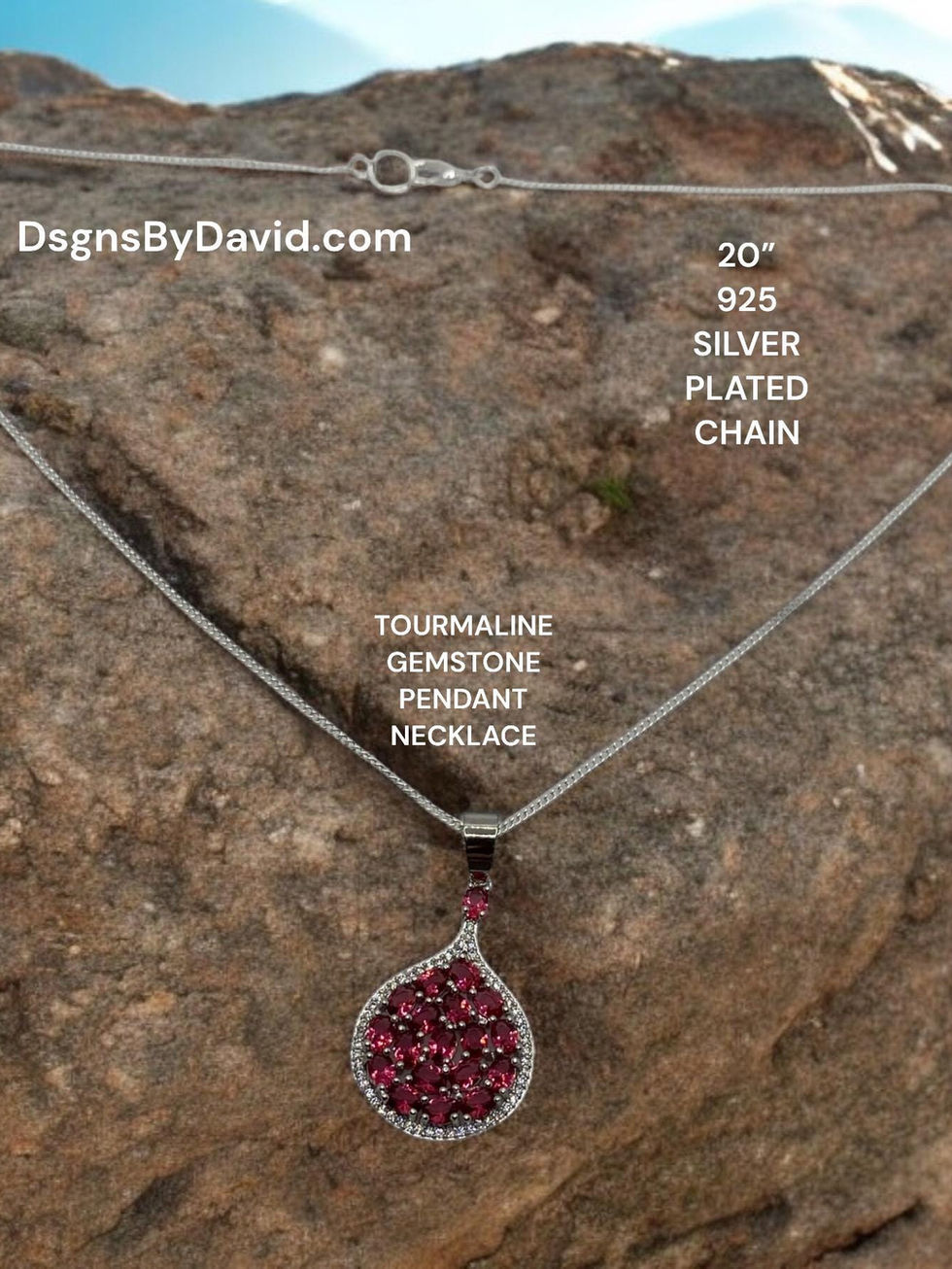 A Ravishing, Eye Catching GEMSTONE PENDANT NECKLACE. This is the perfect Gemstone Necklace to show your HOLIDAY Spirit but also your exquisite taste all year long. Primary Gemstone is TOURMALINE surrounded by WHITE CUBIC ZIRCON Gemstones. TOURMALINE stone symbolizes FRIENDSHIP, COMPASSION, SELF-LOVE, TRANSFORMATION, LOVE and HUMANITARIANISM. Because Tourmaline is primarily linked to the wearer's feelings and emotions it can contribute to one's happiness and prosperity. Tourmaline is the color of NEW LOVE, NEW ROMANCE and NEW RELATIONSHIPS. Cubic Zirconia is believed to improve focus, increase clarity and release the ego. Tourmaline is frequently associated with the HEART and ROOT CHAKRAS. This pendant is about 1.45" (36.8mm) in height and .79" (20.1mm) in width and is on an 20" Sterling Silver Plated Chain. This pendant has a 925 Silver Filled Base. Cubic zirconia stimulates the SOLAR PLEXUS and CROWN CHAKRAS. WHEN YOU WEAR HEALING CRYSTALS IN JEWELRY IT INVITES INSTANT HEALING AS THE VIBRATIONS OF THE STONE CAN GET DIRECTLY UNDER YOUR SKIN. We ship worldwide. You can check the price for International Shipping below. 465