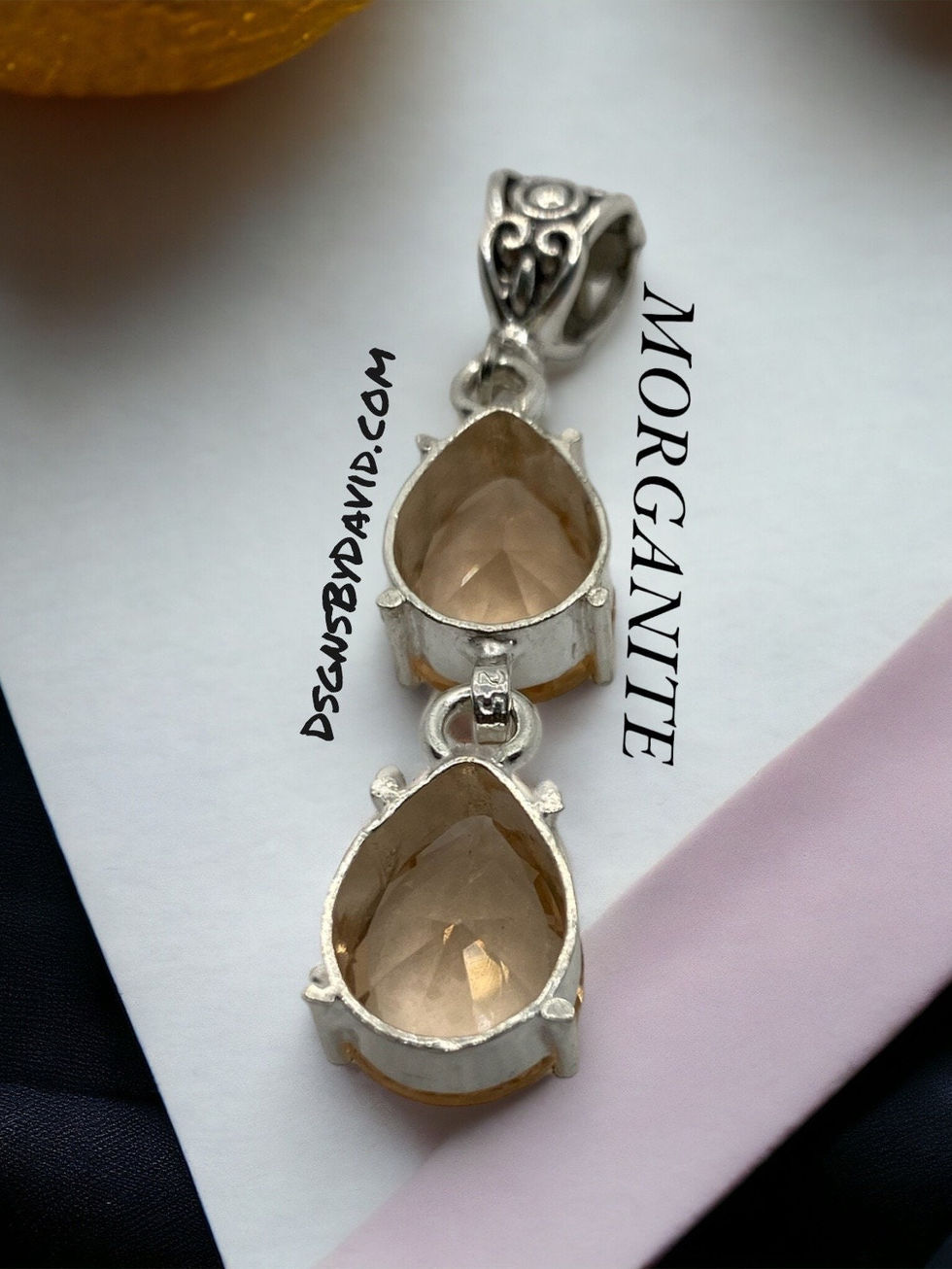 MORGANITE is believed to attract your soul-mate, to deepen current relationships as well as to help with healing and peace when faced with grief or difficult loss. This stone is often associated with innocence, sweetness, romance and love. Morganite can enhance one's ability to communicate and express love and affection. Morganite is said to bring promise to those who wear it. MORGANITE activates the HEART CHAKRA. This pendant is on a 18" Silver Chain. The pendant is 1.89" (48.2mm) in height and .40" (10.1mm) in width. This pendant is 925 Sterling Silver. WHEN YOU WEAR HEALING CRYSTALS IN JEWELRY IT INVITES INSTANT HEALING AS THE VIBRATIONS OF THE STONE CAN GET DIRECTLY UNDER YOUR SKIN We ship worldwide. You can check shipping prices below. Chain length can be adjusted upon request.